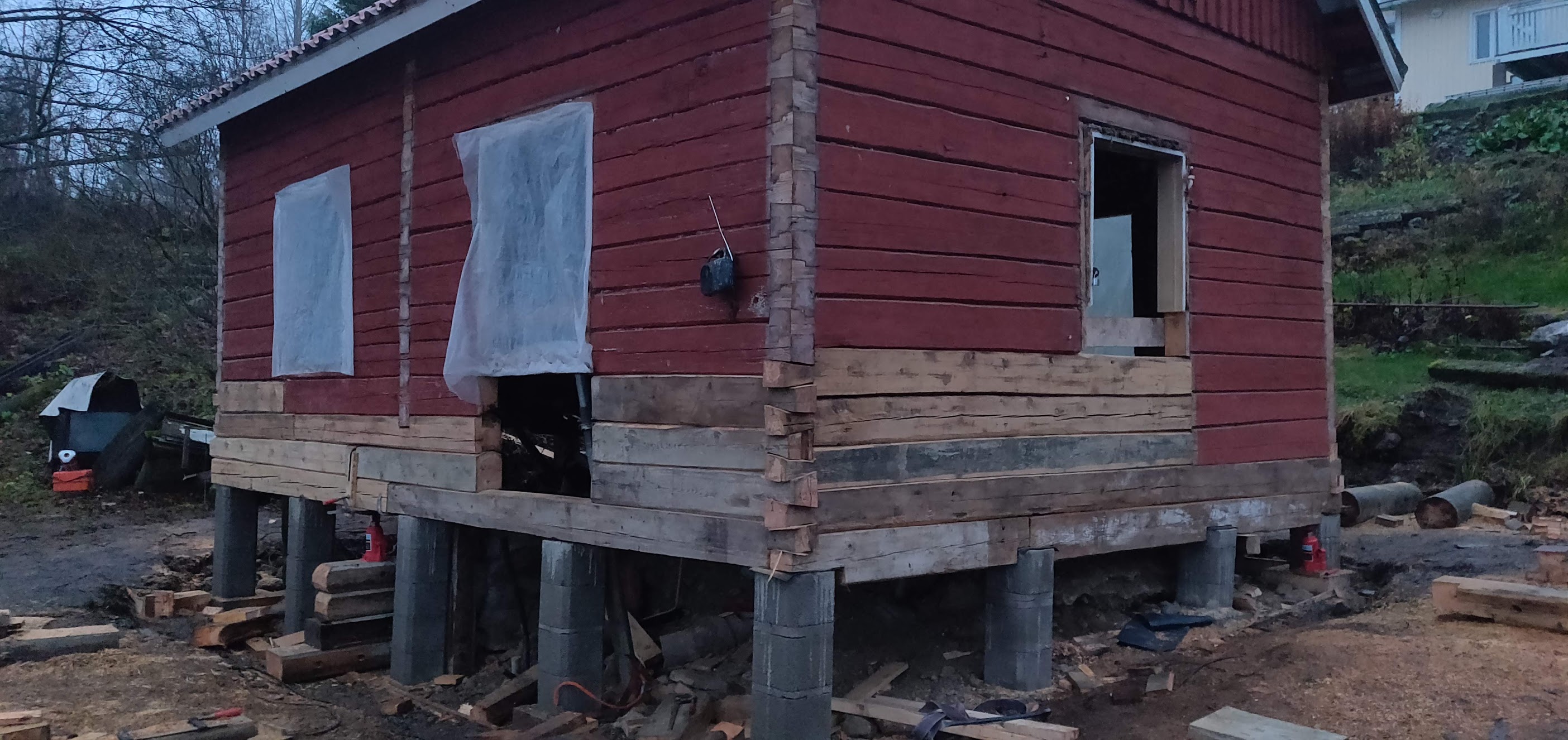 Rakennusta on nostettu kauttaaltaa ja muutama hirsi on vaihdettu.